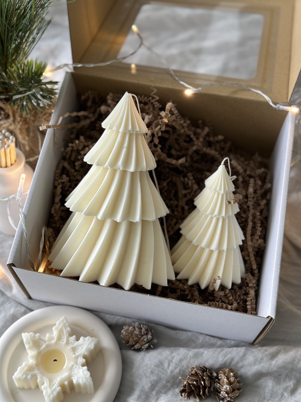 W zestawie świątecznym znajdziesz świece dekoracyjne z kolekcji świątecznej - CHOINKA L i CHOINKA M.