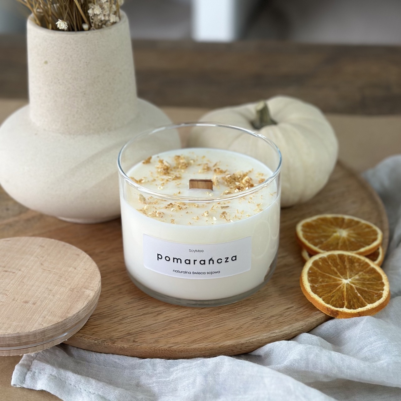 Stwórz niepowtarzalną atmosferę w swoim domu dzięki naturalnej świecy sojowej w szkle. Usłysz przyjemny trzaskający dźwięk, który zapewni drewniany knot ukryty w sercu świecy i poczuj wspaniały aromat wybranej kompozycji zapachowej. Wyprodukowana z najwyższej jakości wosku sojowego, ozdobiona suszonymi kwiatami lub owocami zapewni wiele godzin niezapomnianego klimatu w Twoim wnętrzu.